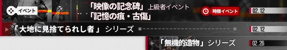 「映像の記念碑」「記憶の痕・古傷」についても公式発表はまだされていません。上級者イベントと書かれているので、高難易度コンテンツだと思われます。2月12日(木)よりリリース予定です。