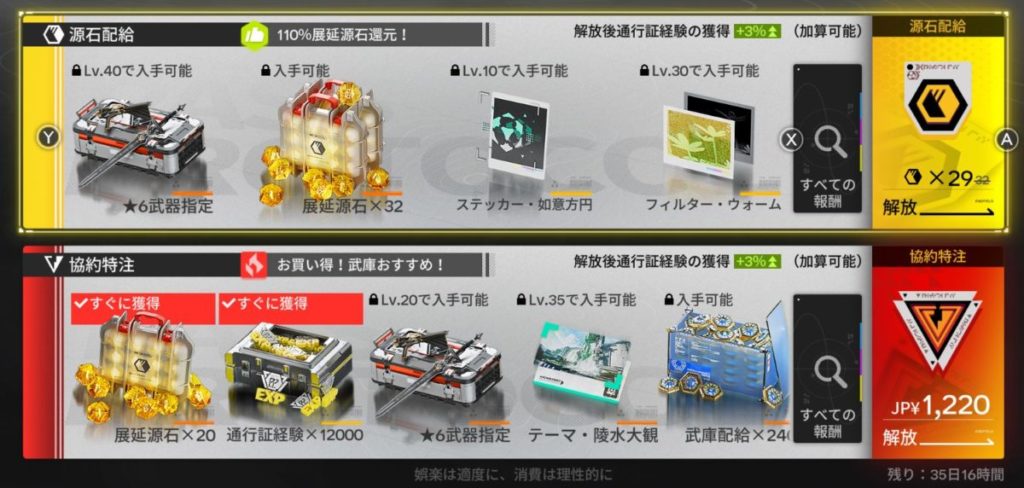 また、無課金の方でも【展延源石】で購入できる源石配給(黄色のほう)を解放すれば、さらに多くの育成素材や★6限定武器を入手できます。