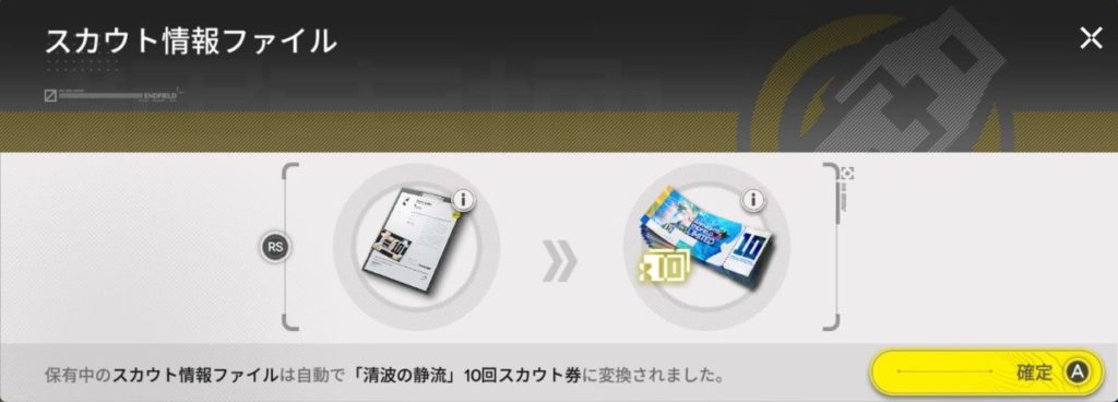また、イヴォンヌを60連以上引いた方は【スカウト情報ファイル】というアイテムを取得しているため、自動的に【「清波の清流」10回スカウト券】に変換されます。