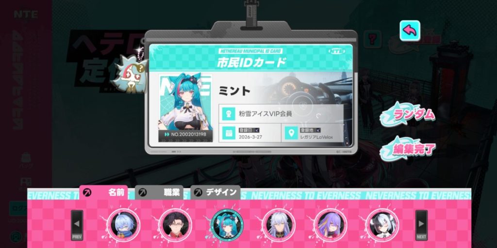 名前(キャラクター)、職業、デザインの3つを変更して、”編集完了“をクリックします。
