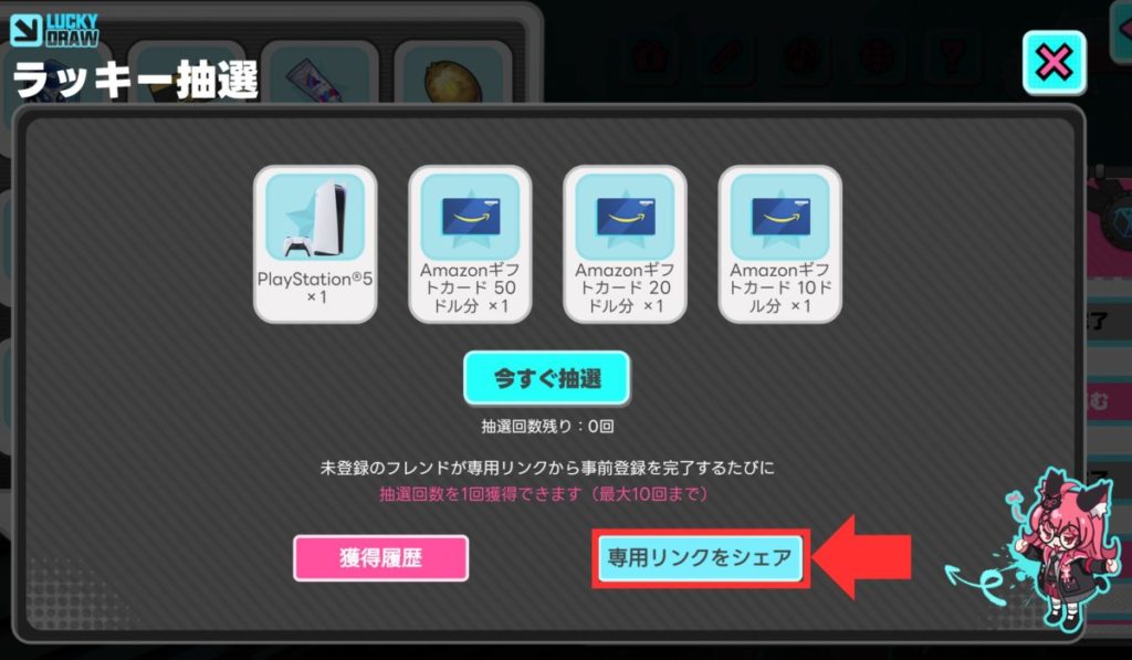 ラッキー抽選はPS5やAmazonギフトカードが当たるガチャです。